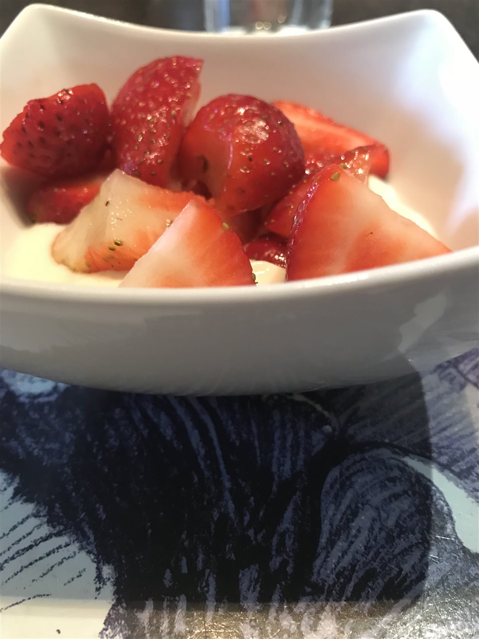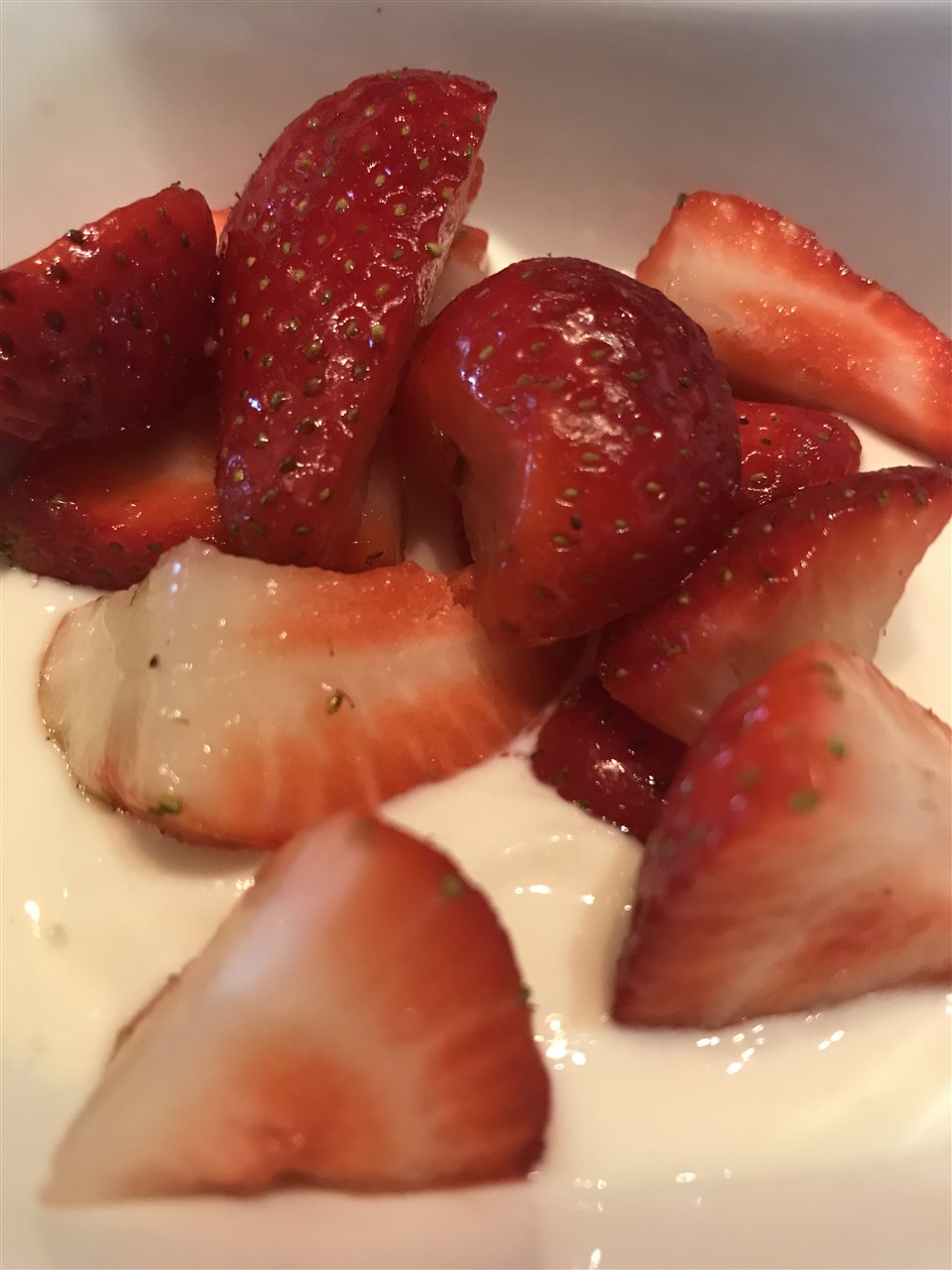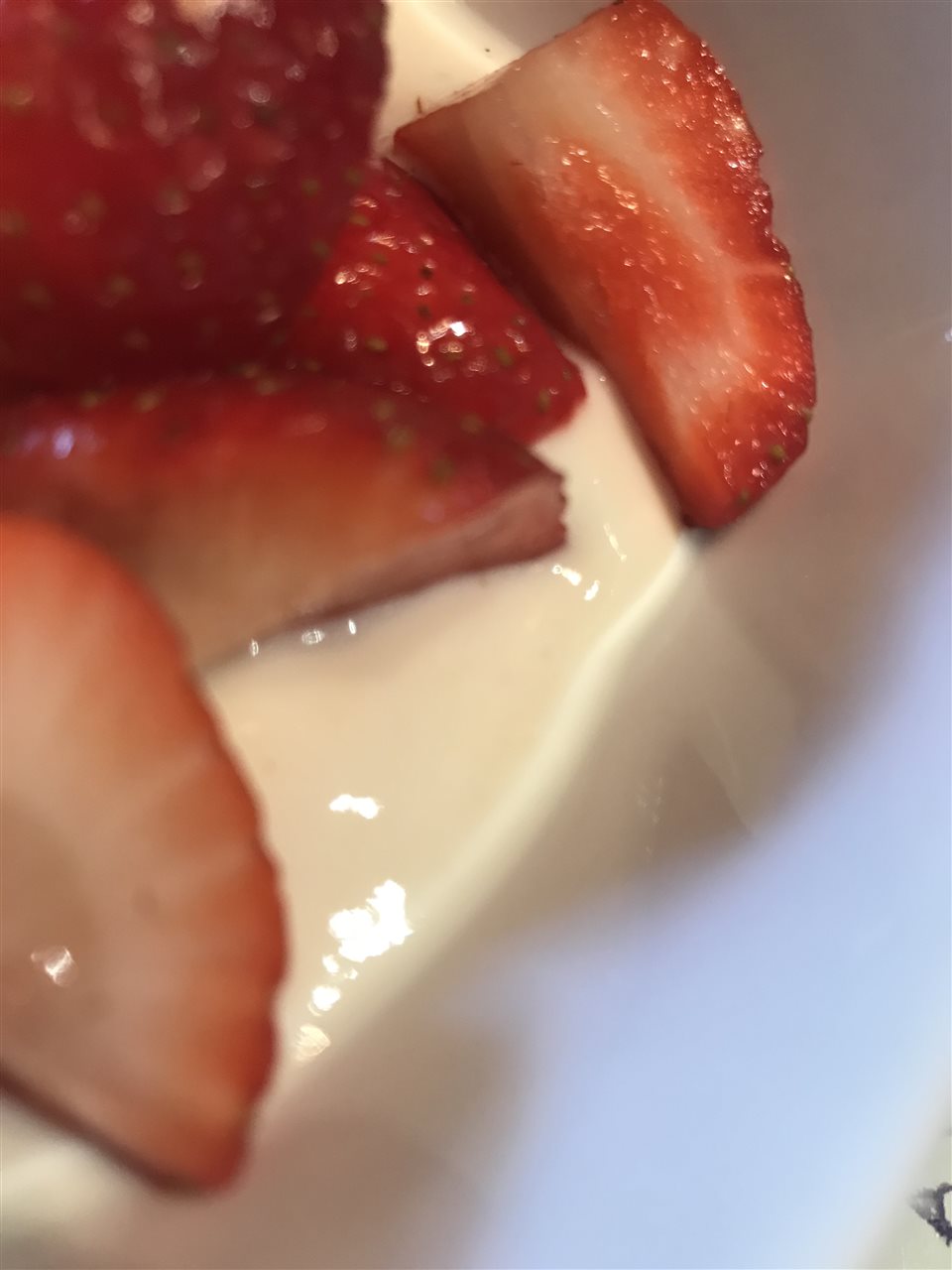 After making dinner, I whipped up some full fat milk into a smooth silky cream. Then I added a few strawberries and a little sprinkle of meringue that I had made earlier.