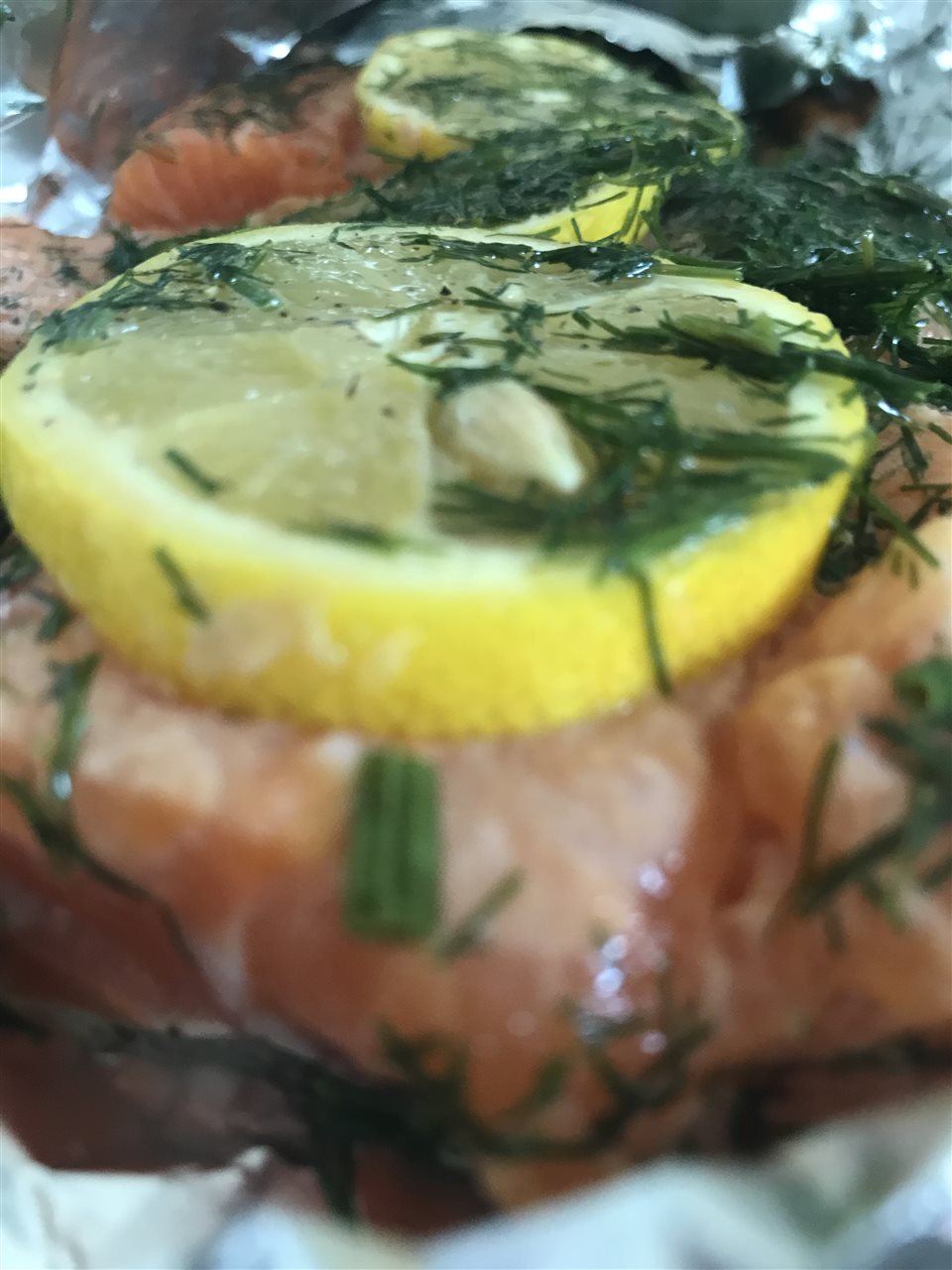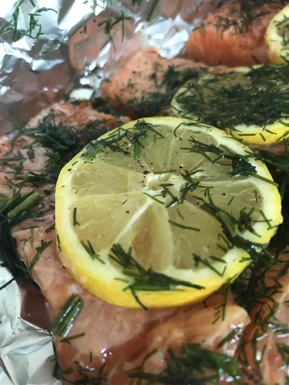 I firstly took the Trout and cut it into four equal pieces.Next I pre heated the over to 200*c.After that I sprinkle on some dill and lemon and put in the oven to cook.
